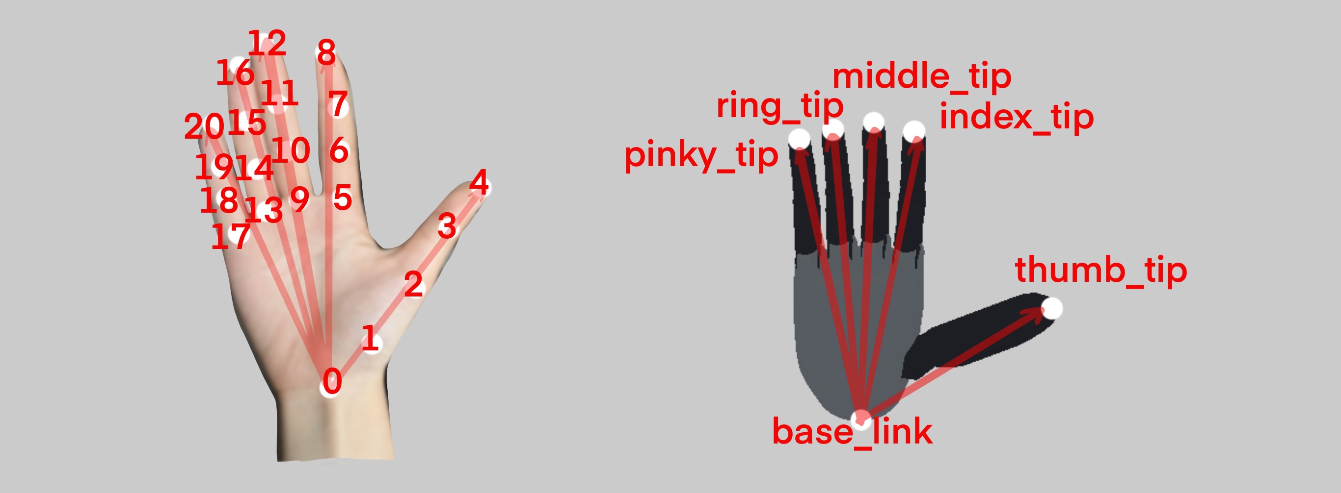 target_origin_link_names: A list of robot link names that define the starting point of each vector on the robot hand. In this case, all vectors start from “base_link”.target_task_link_names: A list of robot link names that define the endpoint of each corresponding vector. These are “thumb_tip”, “index_tip”, “middle_tip”, “ring_tip”, and “pinky_tip” as shown in the right image.target_link_human_indicesis a 2xN array where:The first row specifies the starting keypoint index of the corresponding human hand skeleton vector.