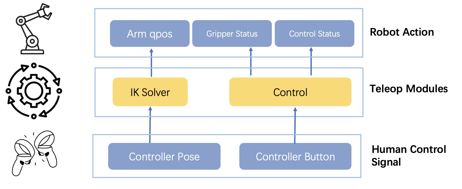Pose Mapping: Controller pose data captured from the VR headset is mapped to arm joint positions through inverse kinematics (IK) solver.