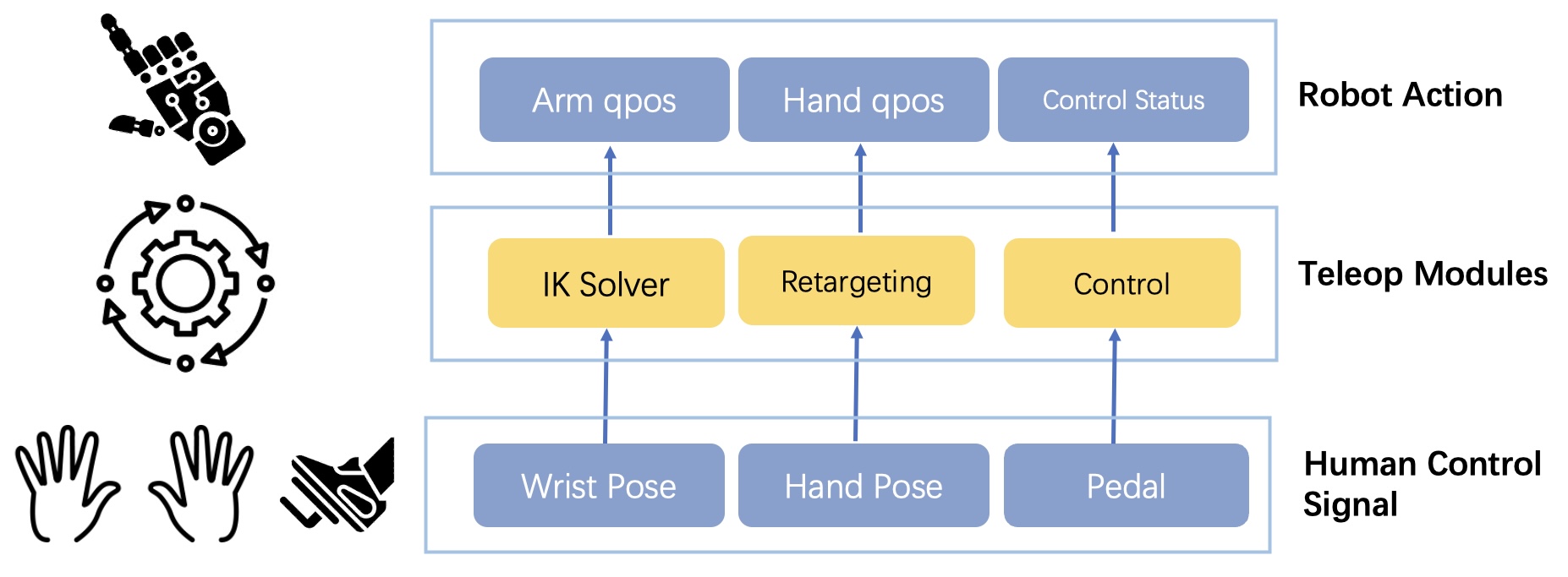 Hand Control: Hand motions from hand tracking are mapped to robotic hand joint positions through retargeting.