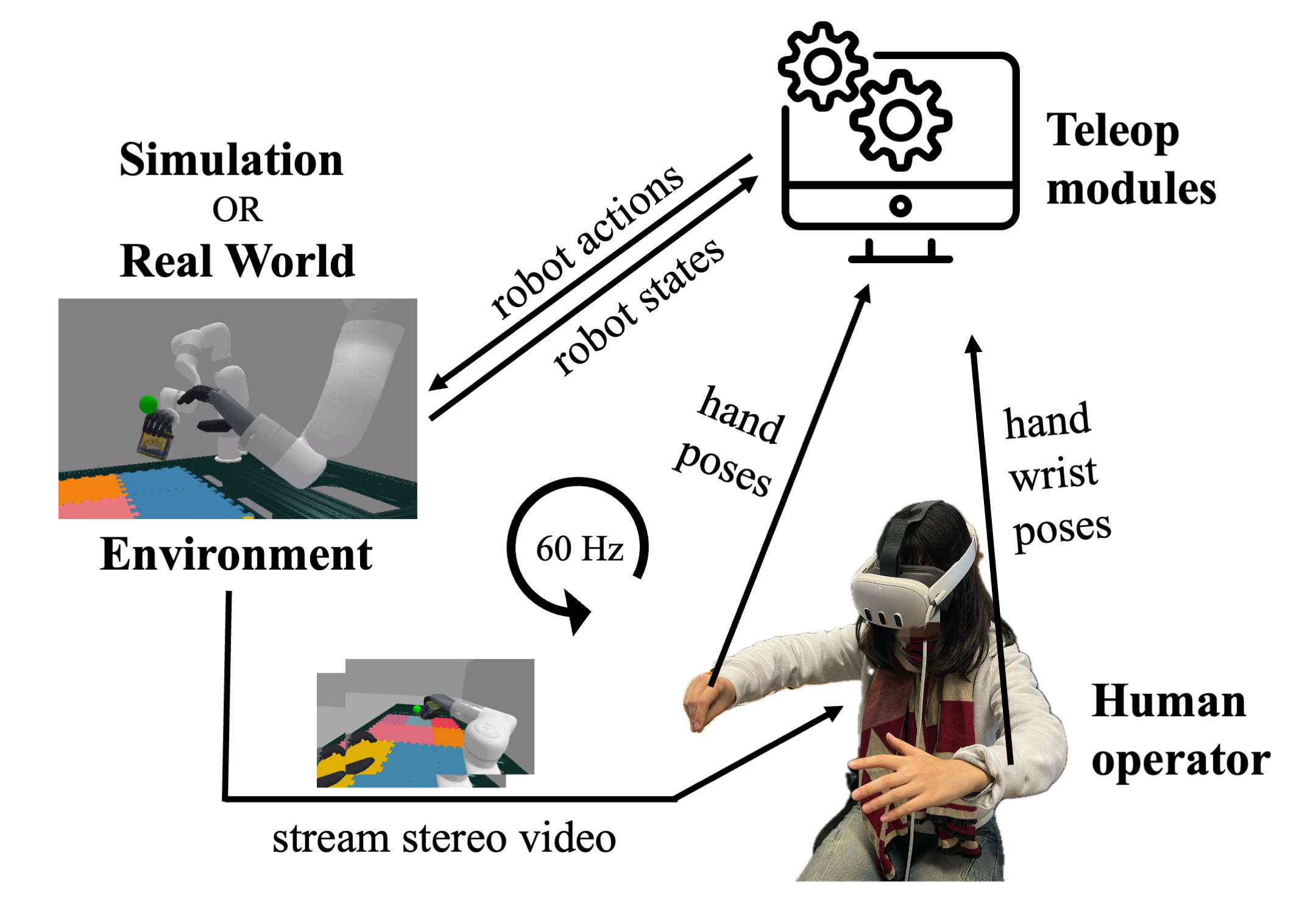 The VR devices continuously stream human pose data to a central server, which retargets the human motions and sends joint commands to the robot. The environment streams stereo video back to the VR headset. While the visual feedback loop can run at 60 FPS, the control loop can operate at a lower frequency.